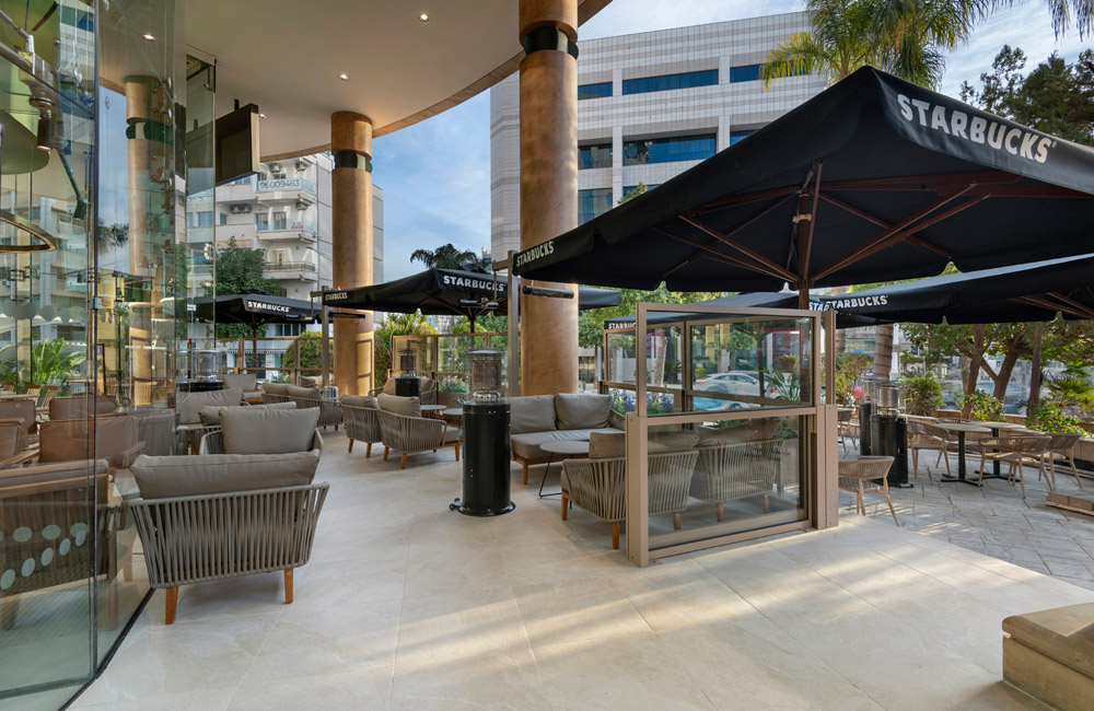 Ο εξωτερικός χώρος, περιμετρικά καλυμμένος από ανεμοφράκτες υψηλής αισθητικής, προσφέρει ένα ζεστό και φιλόξενο περιβάλλον. Τα έπιπλα εξωτερικού χώρου, σε μοντέρνα χρώματα και σχέδια που εκφράζουν απόλυτα την ταυτότητα των Starbucks, συνδυάζουν στιλ και άνεση, σ’ ένα περιβάλλον ιδανικά διαμορφωμένο για κάθε εποχή, με ηλεκτρικές σόμπες να το διατηρούν ζεστό τον χειμώνα και ανεμιστήρες να εξασφαλίζουν το καλοκαίρι την απαραίτητη δροσιά.