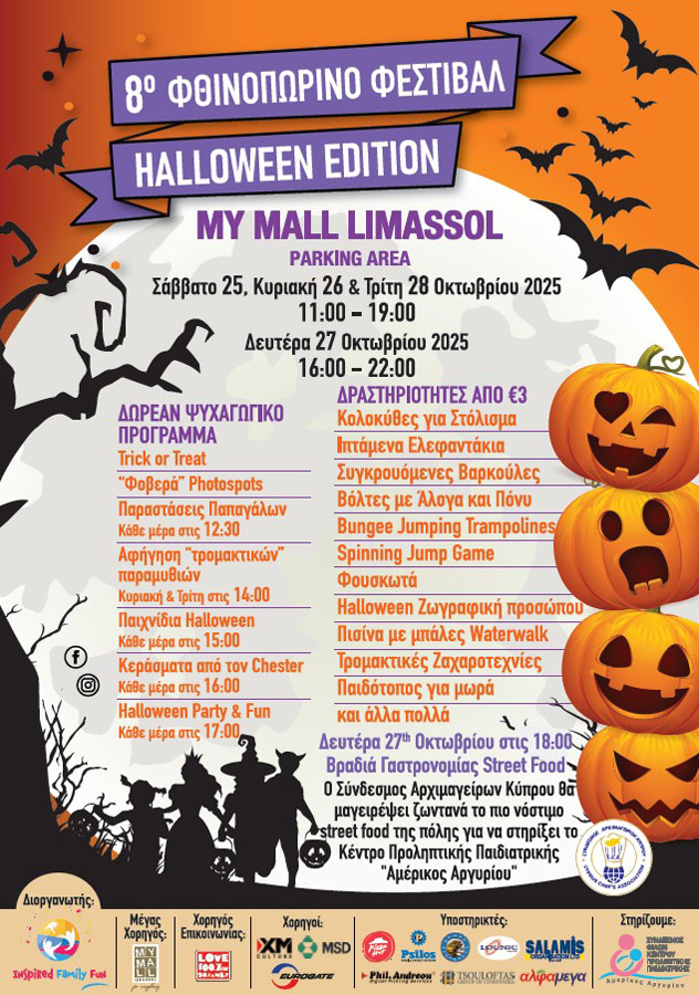 Σας προσκαλούμε το τετραήμερο 25, 26, 27 & 28 Οκτωβρίου 2025 στο My Mall Limassol για να διασκεδάσουμε και να χαρούμε τη μαγεία του Halloween! Ο χώρος στάθμευσης του My Mall Limassol μπαίνει σε ρυθμούς Halloween με χιλιάδες κολοκύθες, φαντασματάκια, μαγισσούλες και μεταμορφώνεται σε μια υπέροχη παιχνιδούπολη γεμάτη παιχνίδια και δραστηριότητες.