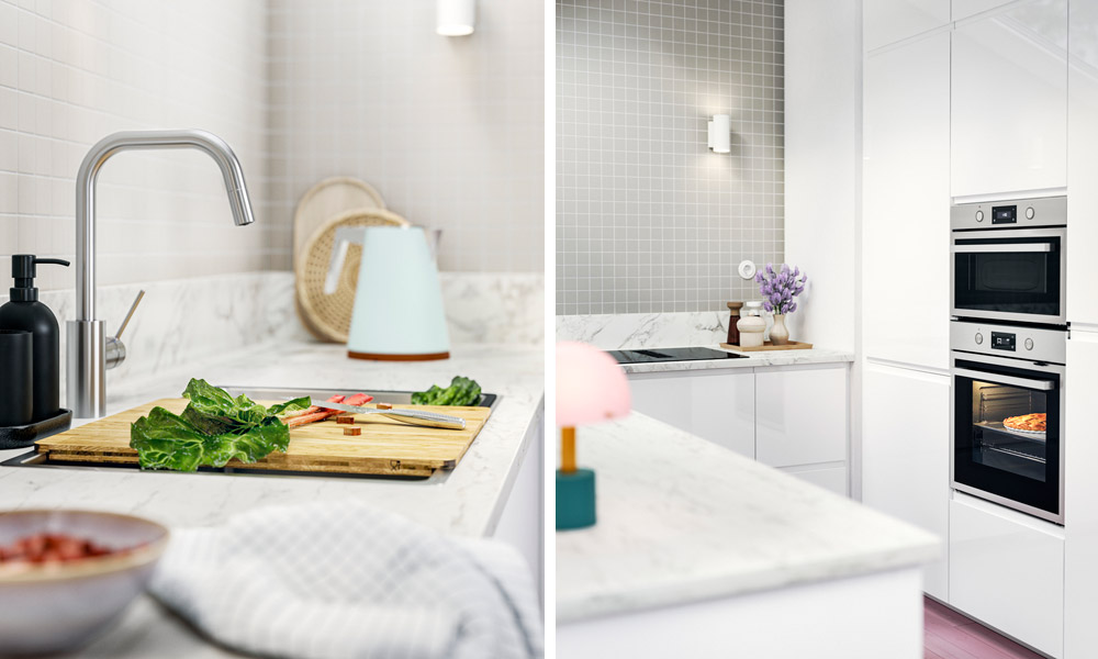 Όσο για τον πάγκο; Δεν χρειάζεται να παρακαλάς να μεγαλώσει. Βάλε έναν μεγάλο δίσκο κοπής πάνω από τον νεροχύτη και θα έχεις αμέσως έξτρα επιφάνεια εργασίας! Το καλύτερο; Το καφέ του ξύλου κάνει αντίθεση με το λευκό της κουζίνας και το αποτέλεσμα το λες και chef’s kiss!