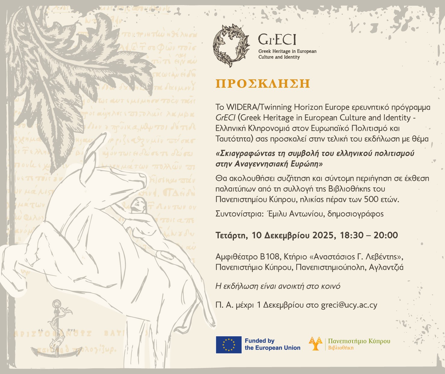 Το τριετές WIDERA/Twinning Horizon Europe ερευνητικό πρόγραμμα GrECI (Greek Heritage in European Culture and Identity), μια συνεργασία του Πανεπιστημίου Κύπρου, του Πανεπιστημίου του Όσλο και του Πανεπιστημίου Franche-Comté της Γαλλίας, ολοκληρώνεται και πραγματοποιεί την τελική του εκδήλωση την Τετάρτη 10 Δεκεμβρίου, 18:30-20:00, στο Αμφιθέατρο Β108 του Πανεπιστημίου Κύπρου, Πανεπιστημιούπολη, Αγλαντζιά.