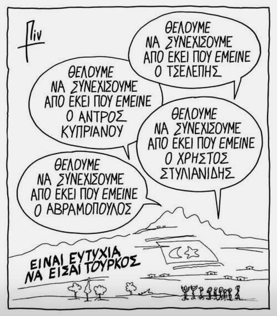 Η πρόσφατη γελοιογραφία του φίλου με τον Πενταδάκτυλο, την τεράστια τουρκική σημαία και τη φράση «Είναι ευτυχία να είσαι Τούρκος» εντάσσεται σε μια βαθύτερη παράδοση κυπριακού εθνικισμού που -αν και καμουφλαρισμένη- εγκλωβίζει τη δημόσια συζήτηση στη νοοτροπία του εμφυλίου παραπόνου. Σατιρίζει όσους θέλουν οι διαπραγματεύσεις να συνεχιστούν από το Κραν Μοντανά, παρουσιάζοντάς τους περίπου ως αφελείς ή, ακόμη χειρότερα, ως χρήσιμους ηλίθιους του τουρκικού επεκτατισμού. Όμως εδώ δεν έχουμε απλώς ένα σχόλιο· έχουμε πολιτικό μήνυμα. Και το μήνυμα αυτό δεν είναι αθώο.