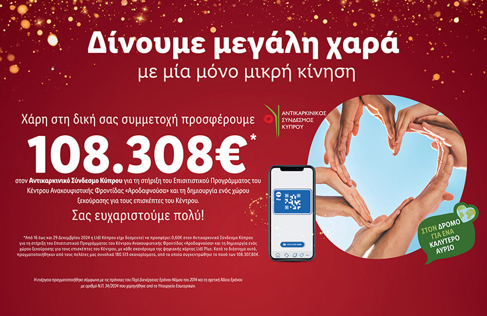Το εν λόγω χρηματικό ποσό συγκεντρώθηκε με την πολύτιμη συμβολή του κοινού στην ενέργεια της Lidl Κύπρου με τίτλο «Δίνουμε μεγάλη χαρά με μία μόνο μικρή κίνηση» κατά την οποία από τις 16 Δεκεμβρίου μέχρι τις 29 Δεκεμβρίου 2023, με κάθε σκανάρισμα της ψηφιακής κάρτας Lidl Plus, η εταιρεία προσέφερε €0,60 στον Αντικαρκινικό Σύνδεσμο Κύπρου. Συγκεκριμένα, κατά το διάστημα αυτό, πραγματοποιήθηκαν συνολικά 180.513 σκαναρίσματα από τα οποία συγκεντρώθηκε συνολικά το ποσό των 108.307,80€.