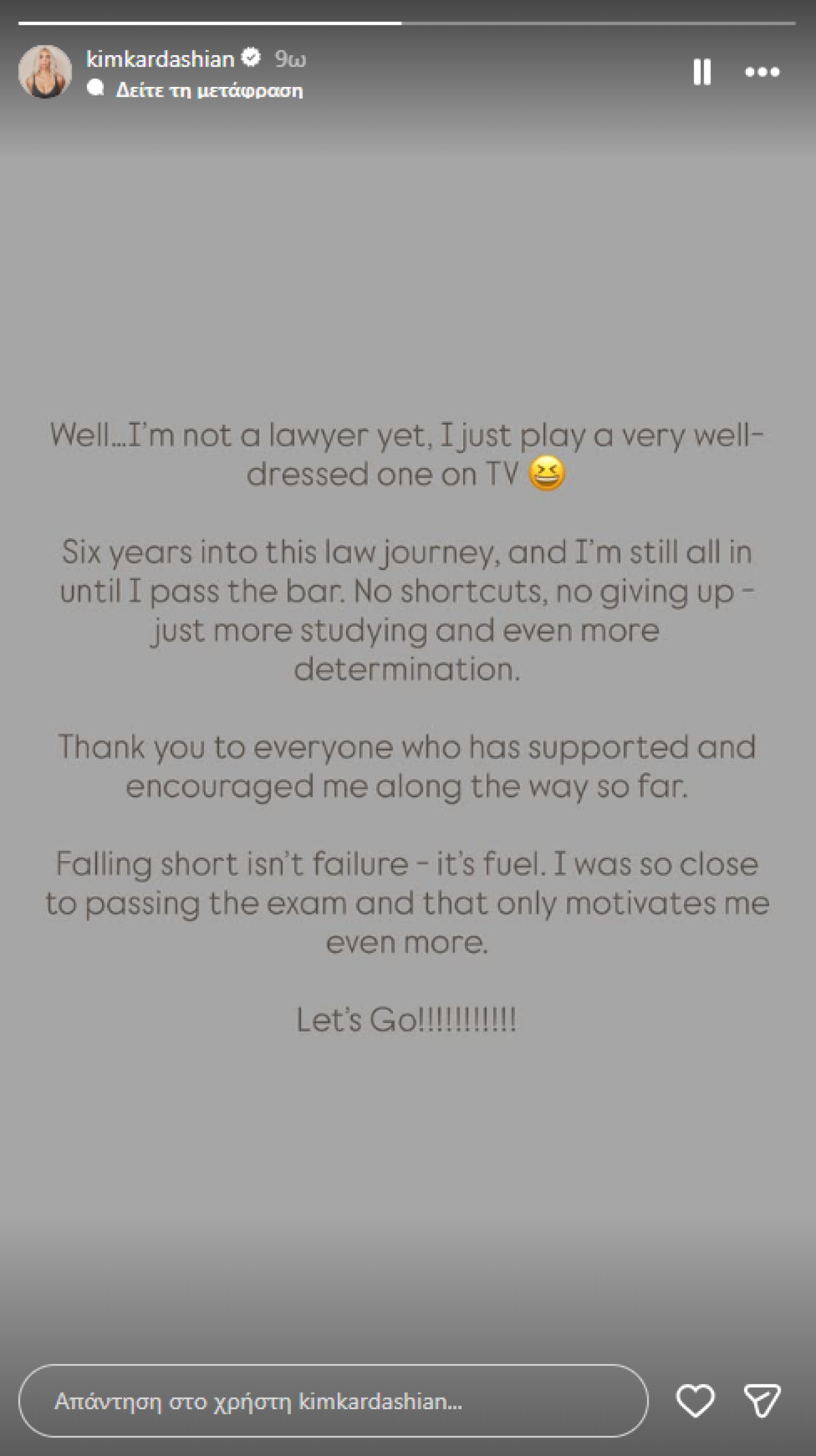 Η Κιμ Καρντάσιαν ευχαρίστησε «όλους όσοι την υποστήριξαν και την ενθάρρυναν» μέχρι τώρα. «Το να πέσεις είναι ενέργεια και όχι αποτυχία. Ήμουν τόσο κοντά στο να περάσω τις εξετάσεις και αυτό με κινητοποιεί ακόμα περισσότερο. Πάμε δυνατά!!!».Η ίδια είχε ανακοινώσει αρχικά την απόφασή της να σπουδάσει Νομική σε συνέντευξή της το 2019 στο περιοδικό Vogue. Εξήγησε ότι την ενέπνευσε η θετική κατάληξη της υπόθεσης της Άλις Μαρί Τζόνσον, την οποία βοήθησε να αφεθεί ελεύθερη το 2018. Στο παρελθόν, έχει μιλήσει πολλές φορές για τις δυσκολίες της να γίνει δικηγόρος, μία επαγγελματική πορεία που είχε ακολουθήσει και ο αείμνηστος πατέρας της, Ρόμπερτ Καρντάσιαν.