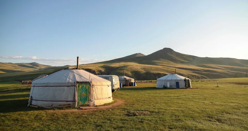Λευκές σκηνές σε χωράφι κατά την ανατολή του ηλίου πάνω από τα yurts στην Μογγολία. UNSPLASH