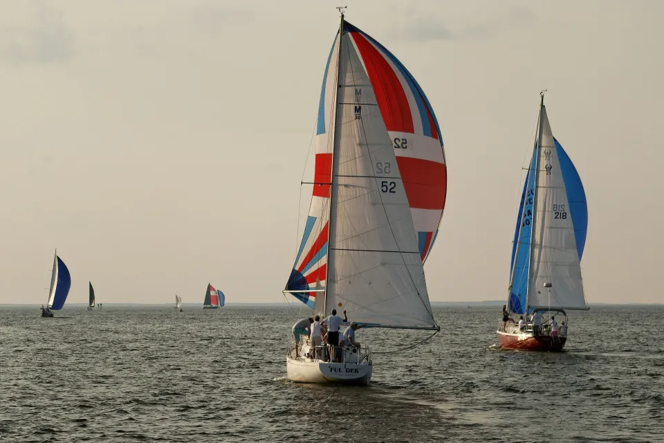Δύο αγωνιστικά ιστιοφόρα κατευθύνονται προς ένα υπήνεμο σημείο σε Νυχτερινού Αγώνα στην περιοχή St Michaels, Η.Π.Α. UNSPLASH