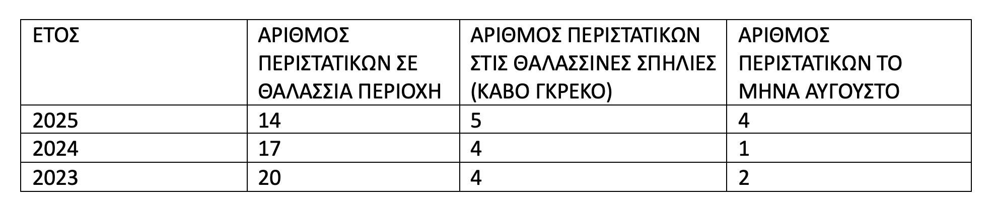 Σύμφωνα με τις σχετικές ανακοινώσεις του Κέντρου Συντονισμού Έρευνας και Διάσωσης (ΚΣΕΔ), τις οποίες επεξεργάστηκε ο «Π», τον Αύγουστο του 2025 τα περιστατικά διάσωσης στη θάλασσα τετραπλασιάστηκαν σε σχέση με τον Αύγουστο του 2024. Συγκεκριμένα, το 2025 έλαβαν χώρα 14 περιστατικά, από τα οποία τα πέντε αφορούσαν τις Θαλασσινές Σπηλιές στο Κάβο Γκρέκο. Τα τέσσερα από αυτά συνέβησαν σε διάστημα 11 ημερών τον μήνα Αύγουστο. Συγκριτικά με τις προηγούμενες δύο χρονιές, ενώ τα συνολικά περιστατικά έχουν μειωθεί και τα περιστατικά στις Θαλασσινές Σπηλιές έμειναν περίπου τα ίδια, η συχνότητά τους έχει αλλάξει. Τα πιο πάνω καταγεγραμμένα περιστατικά αφορούν μόνο την εμπλοκή των διασωστικών υπηρεσιών, με τον πραγματικό αριθμό τραυματιών που καταλήγουν στις Πρώτες Βοήθειες να εκτιμάται πολύ πιο πάνω.
