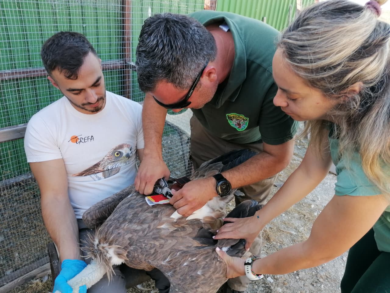 Ο Γύπας, ο οποίος βρίσκεται σήμερα σε κατάσταση ανάρρωσης, σε φωτογραφία του Ιουλίου του 2024. Λειτουργοί του Πτηνολογικού και της Υπηρεσίας Θήρας και Πανίδας τοποθετούν στο φτέρωμά του τον πομπό παρακολούθησης, ο οποίος σήμερα συνέβαλε στο να ηχήσει έγκαιρα «κόκκινος συναγερμός».
