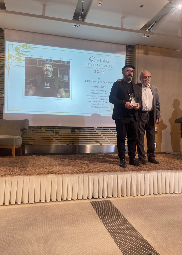 Βραβείο στον Σωτήρη Ευαγγέλου για την καθοριστική συμβολή του στην υποστήριξη της υψηλής γαστρονομίας και για την προσφορά του στον εκσυγχρονισμό και τη σύγχρονη παρουσίαση της Ελληνικής Αστικής Κουζίνας.