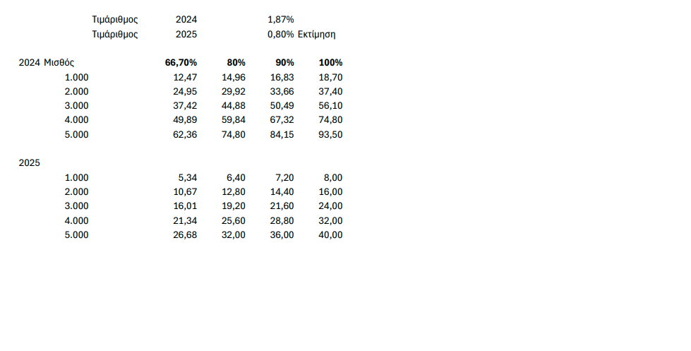 Για μισθούς €5000, απόδοση της ΑΤΑ στο 80% συνεπάγεται έξτρα μηνιαίο ποσό €32, απόδοση στο 90% €36 και απόδοση στο 100% €40.