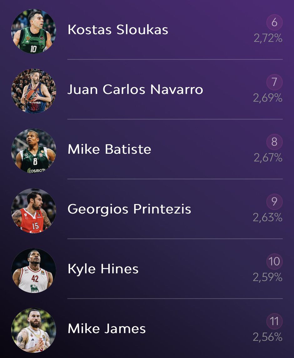 Στην 6η θέση βρέθηκε ο Κώστας Σλούκας, στην 9η ο Γιώργος Πρίντεζης, ενώ την κορυφαία δεκάδα συμπληρώνουν οι Χουάν Κάρλος Ναβάρο, Μάικ Μπατίστ, και Κάιλ Χάινς.