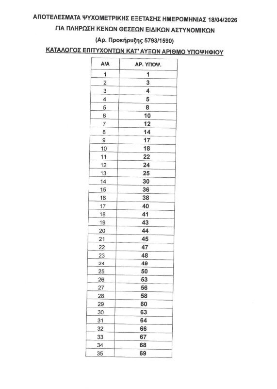 Στη δημοσιότητα έδωσε η Αστυνομία τα αποτελέσματα των Ψυχομετρικών Εξετάσεων για την πρόσληψη Ειδικών Αστυνομικών, στο πλαίσιο της προκήρυξης με αριθμό 5793/1590.