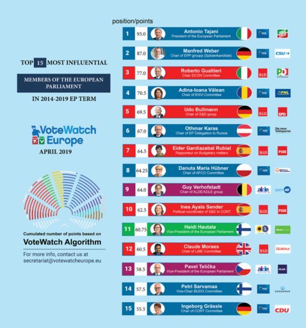 Η έκθεση απολογισμού για την κοινοβουλευτική θητεία 2014-2019, που δημοσίευσε η πλατφόρμα “Vote Watch Europe”, καταγράφει τους ευρωβουλευτές με τη μεγαλύτερη επιρροή στη διαμόρφωση ευρωπαϊκής πολιτικής.