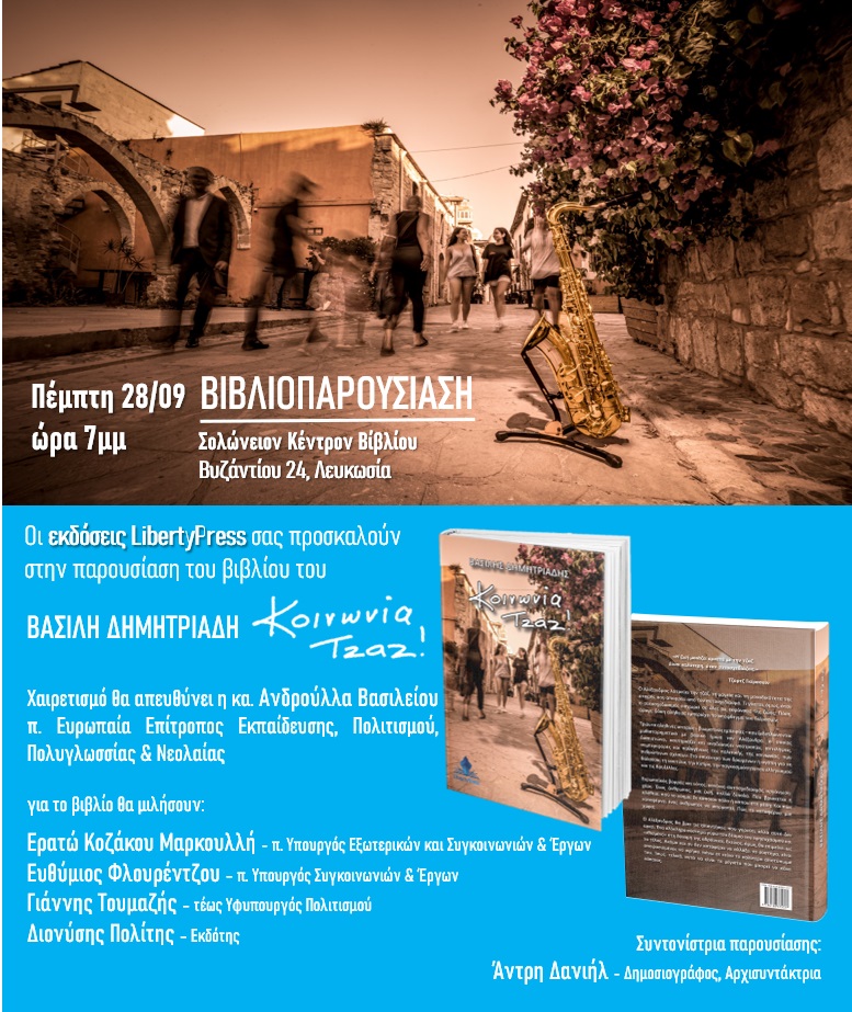 Έχουν προγραμματιστεί δύο παρουσιάσεις του βιβλίου «Κοινωνία Τζαζ» του Βασίλη Δημητριάδη - εκδόσεις LibertyPress. Στη Λεμεσό, μεθαύριο Τρίτη, 26 Σεπτεμβρίου, στο Πολιτιστικό Κέντρο Πάνος Σολομωνίδης, και στη Λευκωσία, την Πέμπτη 28 Σεπτεμβρίου, στο Σολώνειο Κέντρον Βιβλίου. Και οι δύο εκδηλώσεις θα αρχίσουν στις 7:00μμ και είναι ανοικτές για το κοινό.