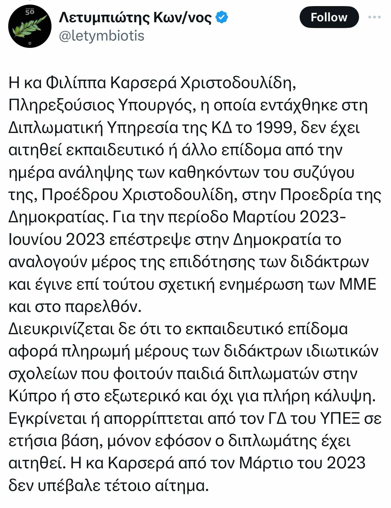 Η κα Φιλίππα Καρσερά Χριστοδουλίδη, Πληρεξούσιος Υπουργός, η οποία εντάχθηκε στη Διπλωματική Υπηρεσία της Κύπρου το 1999, δεν έχει αιτηθεί εκπαιδευτικό ή άλλο επίδομα από την ημέρα ανάληψης των καθηκόντων του συζύγου της, Προέδρου Χριστοδουλίδη, στην Προεδρία της Δημοκρατίας, αναφέρει σε ανάρτησή του στην πλατφόρμα «Χ» ο Κυβερνητικός εκπρόσωπος, Κωνσταντίνος Λετυμπιώτης, με αφορμή την επιστροφή της Πρώτης Κυρίας στο υπουργείο Εξωτερικών