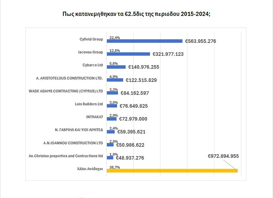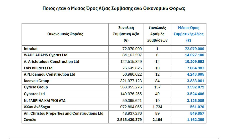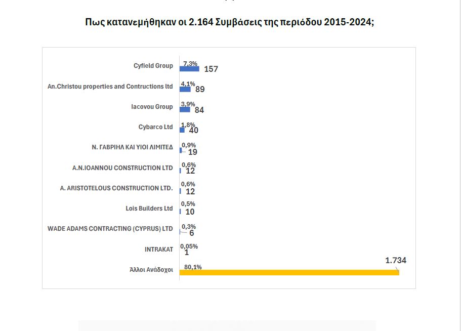 Η ανάλυση των στοιχείων που αντλήθηκαν από το ηλεκτρονικό σύστημα δημοσίων συμβάσεων (eProcurement) κατέδειξε ότι, παρά την ανάθεση μεγάλου αριθμού δημοσίων συμβάσεων – 2.164 συνολικά – ένα σημαντικό ποσοστό της συνολικής συμβατικής αξίας συγκεντρώθηκε σε περιορισμένο αριθμό εργολάβων και, συγκεκριμένα, σε μόλις τρεις ομίλους εταιρειών: Cyfield, Iacovou και Cybarco. Παρότι ανέλαβαν μόλις το 13% του συνολικού αριθμού των δημόσιων έργων, εξασφάλισαν το 40,8% της συνολικής αξίας της αγοράς. Συγκεκριμένα, η Cyfield κέρδισε 157 δημόσιες συμβάσεις αξίας €564 εκατ., η Iacovou 84 συμβάσεις αξίας €322 εκατ. και η Cybarco 40 συμβάσεις αξίας €141 εκατ. Οι πίνακες που δημοσιεύουμε είναι αρκούντως διαφωτιστικοί.