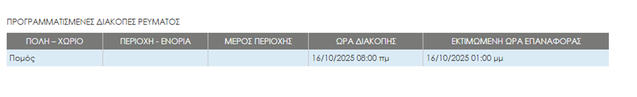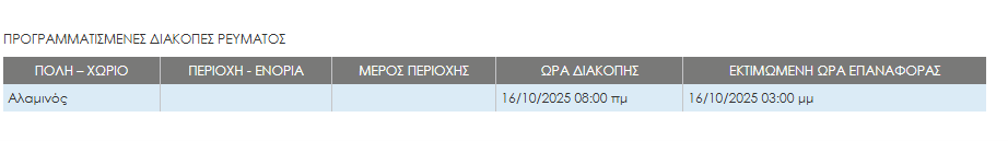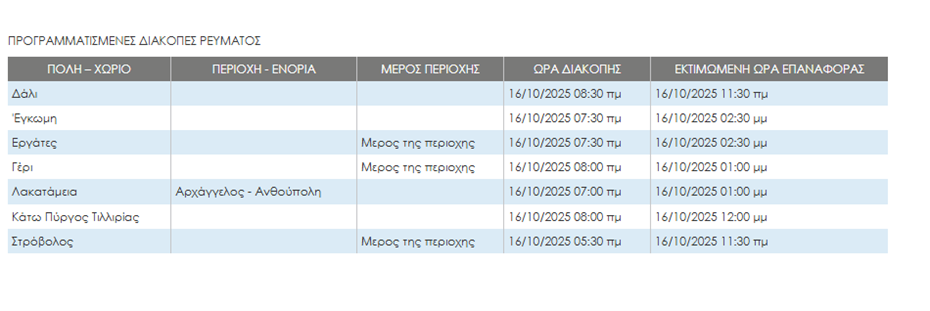 Σε εξέλιξη βρίσκονται οι προγραμματισμένες διακοπές ρεύματος που ανακοίνωσε η Αρχή Ηλεκτρισμού Κύπρου (ΑΗΚ) για σήμερα, Τετάρτη 16 Οκτωβρίου 2025, σε διάφορες περιοχές των επαρχιών Λευκωσίας, Λάρνακας και Πάφου, σύμφωνα με την ενημέρωση που αναρτήθηκε στην ιστοσελίδα της Αρχής.