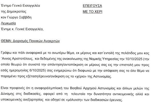 Στο κείμενο της επιστολής, ο δικηγόρος προσθέτει ότι η ανακοίνωση της Νομικής Υπηρεσίας στις 10 Οκτωβρίου 2025 «δεν βοηθά καθόλου στην ανατροπή της εν λόγω πολύ ανησυχητικής κατάστασης», υπογραμμίζοντας ότι «αντίθετα, εντείνει την ανησυχία».