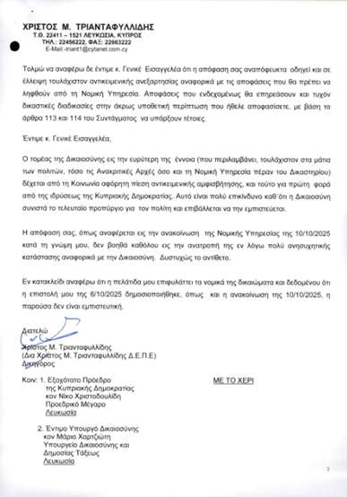 Ο κ. Τριανταφυλλίδης καταλήγει ότι η πελάτισσά του «επιφυλάσσεται των νομικών της δικαιωμάτων», επισημαίνοντας πως, μετά και τη δημοσιοποίηση της προηγούμενης επιστολής της 6ης Οκτωβρίου, «η εμπιστοσύνη προς τη Νομική Υπηρεσία δεν μπορεί να θεωρηθεί δεδομένη».
