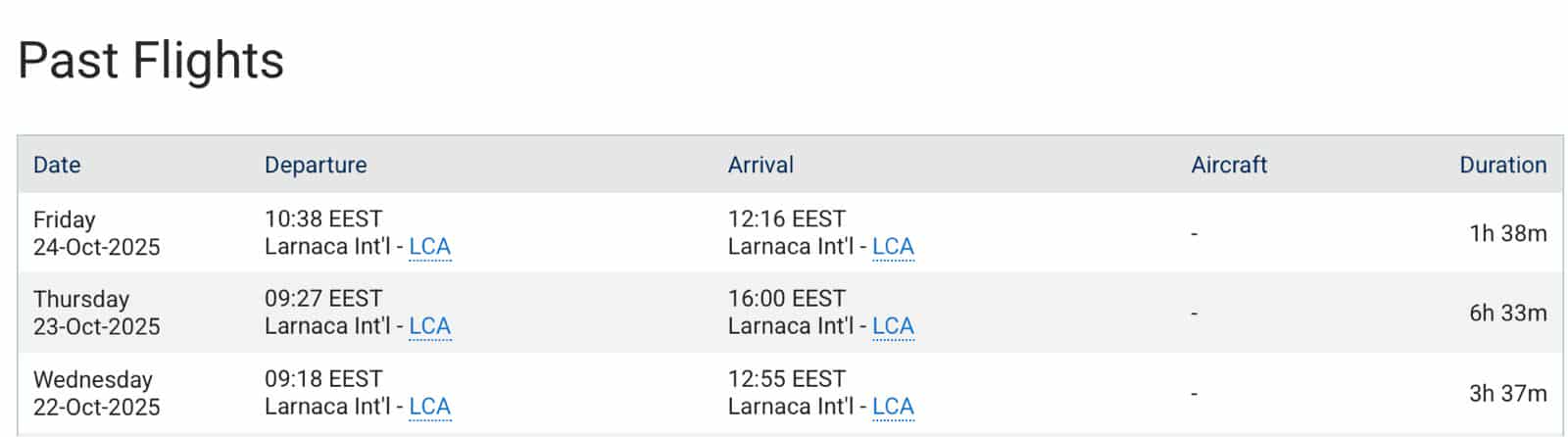 Σύμφωνα με την καταγραφή των σχεδίων πτήσης, το εν λόγω αεροσκάφος απογειώθηκε στις 09:47 από το αεροδρόμιο Λάρνακας και βρίσκεται ακόμα στον αέρα. Πετά στα 360m με ταχύτητα 167mph.