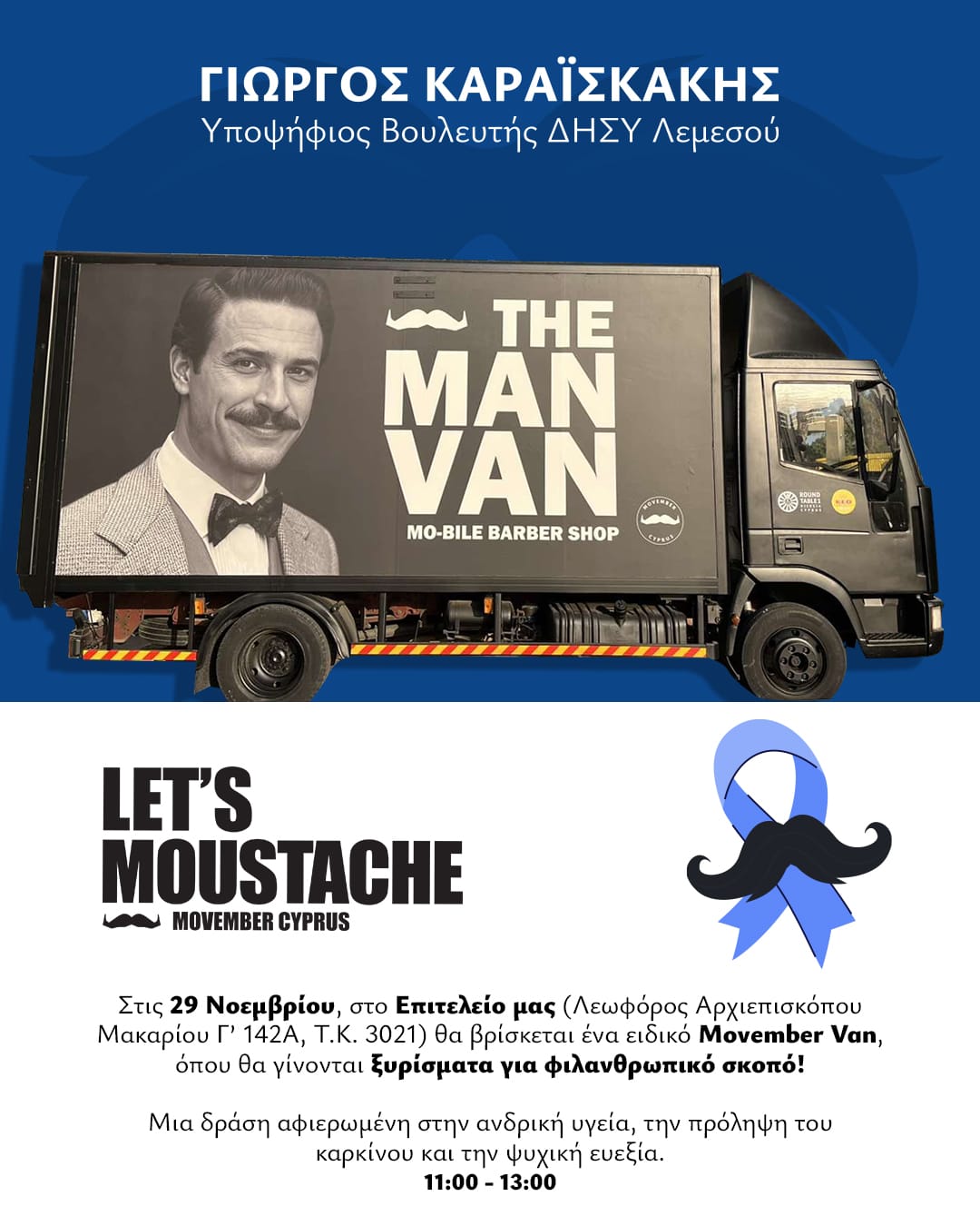 Συγκεκριμένα, το ειδικό Movember Van θα βρίσκεται στο γραφεία του επιτελείου του υποψηφίου βουλευτή, στη Λεωφόρο Αρχιεπισκόπου Μακαρίου Γ’ 142, στη Λεμεσό, ώστε να πραγματοποιηθούν ξυρίσματα ανδρών για ευαισθητοποίηση του κοινού σε θέματα υγείας και πρόληψης.