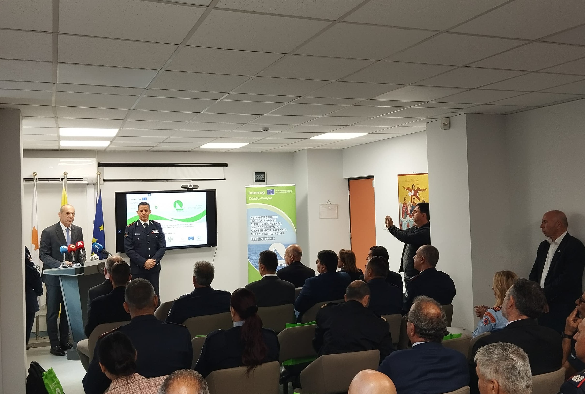 Αναφορά στην προμήθεια νέου οχήματος συντονισμού που θα ενισχύσει την Πολιτική Άμυνα, το οποίο θα λειτουργεί ως κινητό κέντρο διοίκησης ακόμη και σε συνθήκες πλήρους τηλεπικοινωνιακής κατάρρευσης, έκανε ο Γενικός Διευθυντής του Υπουργείου Εσωτερικών, Ελίκκος Ηλία. Ιδιαίτερη βαρύτητα έδωσε και στο εκπαιδευτικό σκέλος του έργου, το οποίο περιλαμβάνει τρία εξειδικευμένα εργαστήρια για τη διαχείριση σεισμικών καταστροφών. Ο κ. Ηλία γνωστοποίησε ότι στελέχη των Πυροσβεστικών Σωμάτων Ελλάδας και Κύπρου θα εκπαιδευτούν αρχικά και στη συνέχεια θα αποτελέσουν τους εκπαιδευτές των προγραμμάτων σε Κύπρο και Κρήτη.