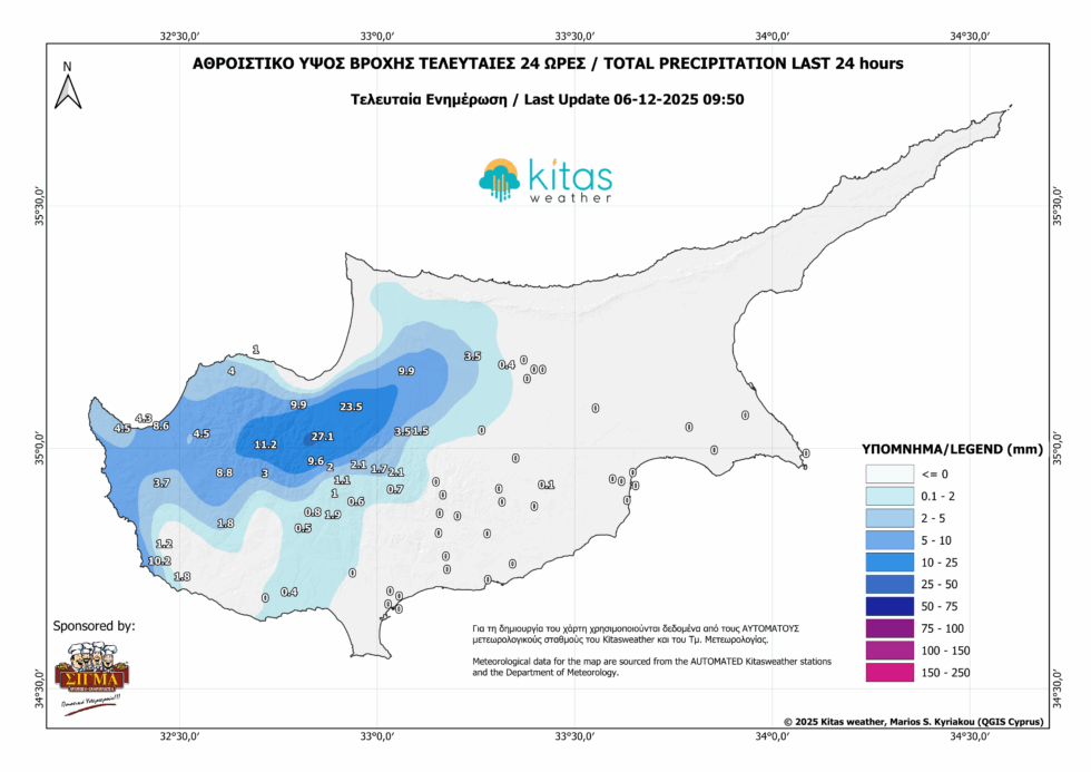 Μεμονωμένες καταιγίδες που εισήλθαν στο νησί από τα δυτικά και βορειοδυτικά χθες το βράδυ προκάλεσαν τοπικές βροχές και χαλαζόπτωση, κυρίως στην επαρχία Πάφου και σε περιοχές δυτικά της οροσειράς του Τροόδους. Στον σχετικό χάρτη του kitasweather καταγράφονται τα συνολικά ύψη βροχής στις ελεύθερες περιοχές:
