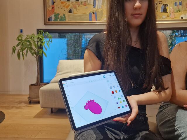 Η Μαρία μας δείχνει το μπρελόκ, σε σχήμα παιδικής πατούσας, που έχει σχεδιάσει. Μαζί με το κουτί όπου θα μπουν οι αισθητήρες (στο μαξιλαράκι) θα εκτυπωθούν σε 3D printer και έτσι θα προκύψει το πρωτότυπο.