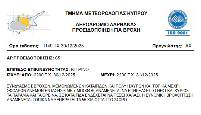 Η προειδοποίηση τίθεται σε ισχύ από σήμερα το βράδυ στις 22:00 μέχρι τις 22:00 το βράδυ της παραμονής πρωτοχρονιάς