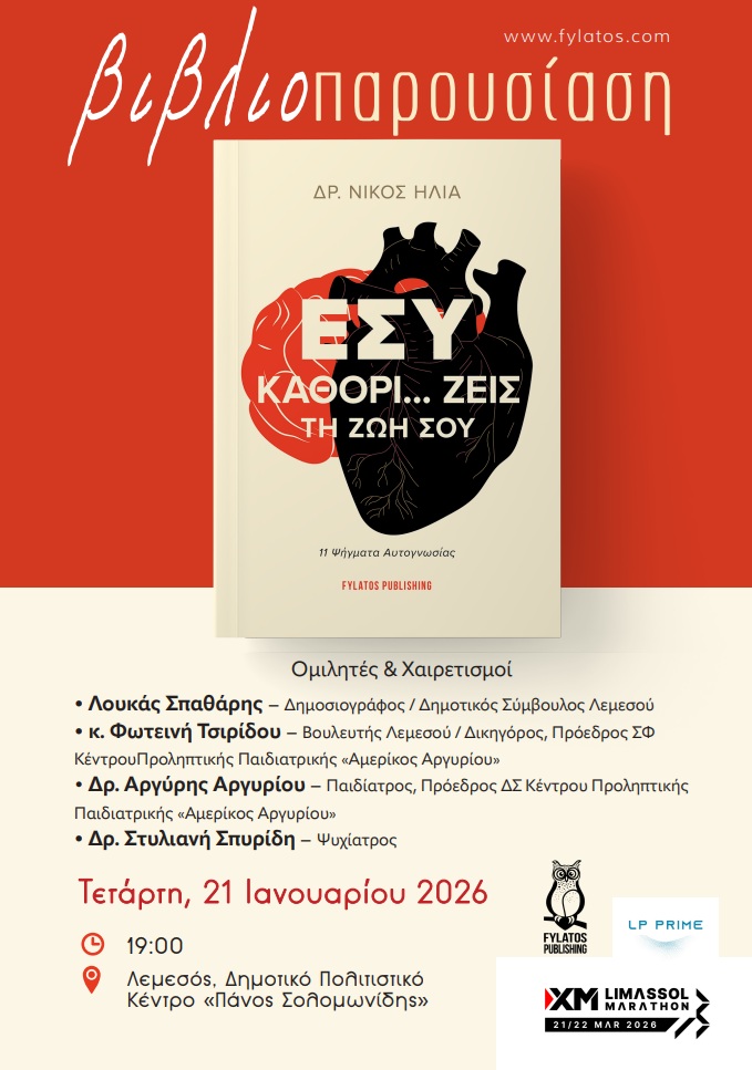 Ερωτηθείς για ποιους έχει γράψει το βιβλίο «Εσύ καθορί…ΖΕΙΣ τη ζωή σου», ο Δρ Νίκος Ηλία απάντησε πως γράφτηκε για ανθρώπους που νιώθουν ότι έχουν απομακρυνθεί από τον εαυτό τους και επιθυμούν να ξαναπάρουν ενεργό ρόλο στη ζωή τους. «Απευθύνεται σε όσους κουράστηκαν να ζουν με αυτόματο πιλότο, εγκλωβισμένοι σε φόβους, ρόλους και προσδοκίες άλλων, και αναζητούν έναν πιο συνειδητό τρόπο ύπαρξης. Είναι για εκείνους που δεν ζητούν έτοιμες συνταγές ευτυχίας, αλλά εργαλεία αυτογνωσίας, ευθύνης και ουσιαστικής αλλαγής. Το βιβλίο απευθύνεται σε όσους είναι έτοιμοι να αναλάβουν την ευθύνη των επιλογών τους και να κατανοήσουν ότι η αλλαγή δεν ξεκινά απ’ έξω, αλλά από τη σχέση που χτίζουν με τον εαυτό τους και τη ζωή τους» συμπλήρωσε. Το εν λόγω βιβλίο θα παρουσιαστεί την Τετάρτη, 21 Ιανουαρίου 2026, στις 19:00, στο Δημοτικό Πολιτιστικό Κέντρο «Πάνος Σολομωνίδης», στη Λεμεσό.