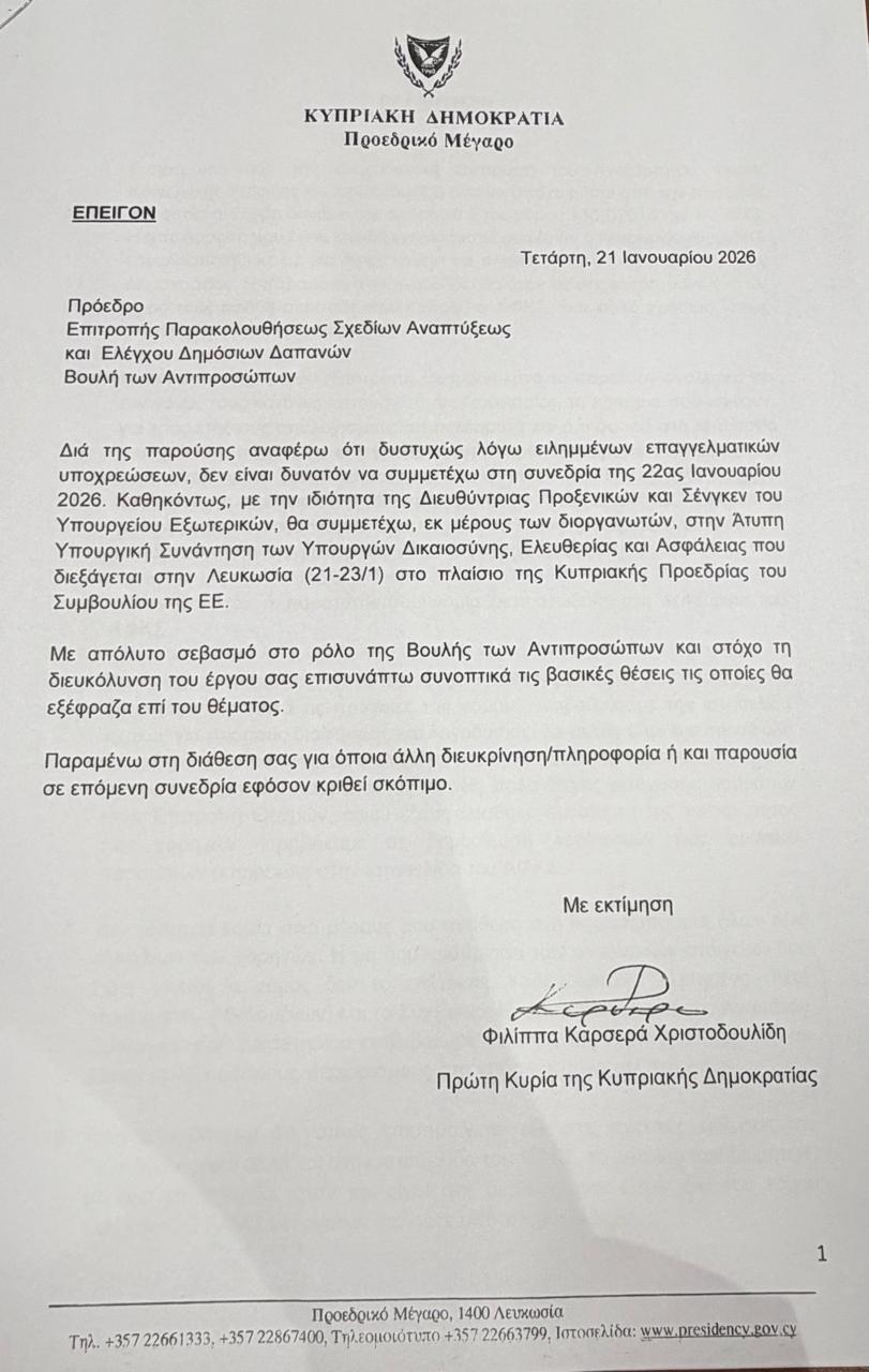 Κατά την έναρξη της συζήτησης, ο πρόεδρος της Επιτροπής, Ζαχαρίας Κουλίας, ενημέρωσε για την απουσία της Πρώτης Κυρίας καθώς και για την ύπαρξη σχετικής επιστολής, στην οποία αναφέρεται ότι δεν μπορεί να παρευρεθεί επειδή προεδρεύει Επιτροπής στο πλαίσιο της προεδρίας της ΕΕ. Στην επιστολή αναφέρει ότι αποστέλλει τις βασικές της θέσεις επί του θέματος προς υποβοήθηση του έργου της Επιτροπής και εκφράζει ετοιμότητα να παραστεί σε μελλοντική συνεδρία της Βουλής αν χρειαστεί.