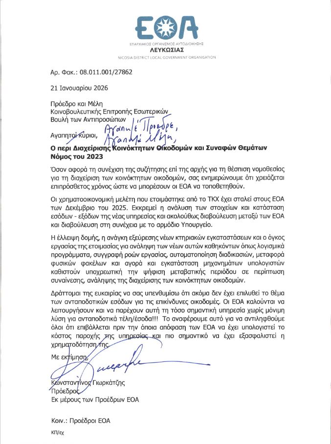 Στην επιστολή του προς τη Βουλή, ο Κωνσταντίνος Γιωρκάτζης αναφέρει, μεταξύ άλλων, τα εξής: «Όσον αφορά τη συνέχιση της συζήτησης για τη θέσπιση νομοθεσίας για τη διαχείριση των κοινόκτητων οικοδομών, σας ενημερώνουμε ότι χρειάζεται επιπρόσθετος χρόνος ώστε να μπορέσουν οι ΕΟΑ να τοποθετηθούν. Η χρηματοοικονομική μελέτη που ετοιμάστηκε από το Τμήμα Κτηματολογίου και Χωρομετρίας έχει σταλεί στους ΕΟΑ τον Δεκέμβριο του 2025. Εκκρεμεί η ανάλυση των στοιχείων και η κατάσταση εσόδων - εξόδων της νέας υπηρεσίας και ακολούθως διαβούλευση μεταξύ των ΕΟΑ και διαβούλευση στη συνέχεια με το αρμόδιο υπουργείο. (...) Οι ΕΟΑ καλούνται να λειτουργήσουν και να παρέχουν αυτή την τόσο σημαντική υπηρεσία χωρίς μόνιμη λύση για ανταποδοτικά τέλη/έσοδα. Το αναφέρουμε αυτό για να αντιληφθούμε όλοι ότι, επιβάλλεται πριν την όποια απόφαση των ΕΟΑ να έχει υπολογιστεί το κόστος παροχής της υπηρεσίας και πιο σημαντικό να έχει εξασφαλιστεί η χρηματοδότησή της».