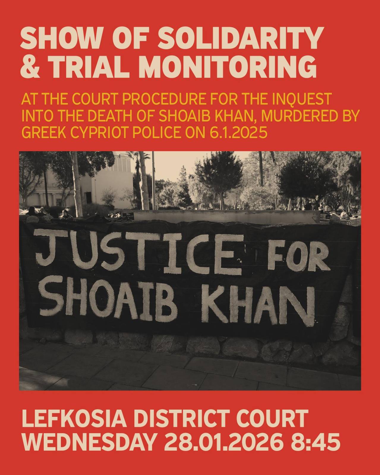 Αρχίζει σήμερα, Τετάρτη 28 Ιανουαρίου 2026, στις 10 το πρωί, ενώπιον του Επαρχιακού Δικαστηρίου Λευκωσίας, η θανατική ανάκριση για τη δολοφονία του Shoaib Khan, του νεαρού μετανάστη που έχασε τη ζωή του από αστυνομικά πυρά στην Ποταμιά, κοντά στη Νεκρή Ζώνη, στις 6 Ιανουαρίου 2025. Την εξέλιξη χαιρετίζει η Πρωτοβουλία Justice for Shoaib Khan, τονίζοντας ότι η διαδικασία ξεκινά ύστερα από επίμονες πιέσεις της οικογένειας και αλληλέγγυων, οι οποίοι ζητούν αλήθεια, λογοδοσία και δικαιοσύνη.