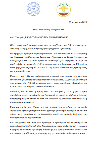 Σε κοινή ανακοίνωση που εξέδωσαν οι συντεχνίες του ΡΙΚ, ΣΥΤΥΡΙΚ-ΟΗΟ ΣΕΚ και ΣΗΔΗΚΕΚ-ΠΕΟ, αναφέρουν ότι «για ακόμη μία φορά μαθαίνουν σημαντικές εξελίξεις που αφορούν στη λειτουργία του ΡΙΚ από τα ΜΜΕ χωρίς κανένας να μπει στο κόπο να ενημερώσει υπεύθυνα τους εργαζόμενους και τις συντεχνίες τους».