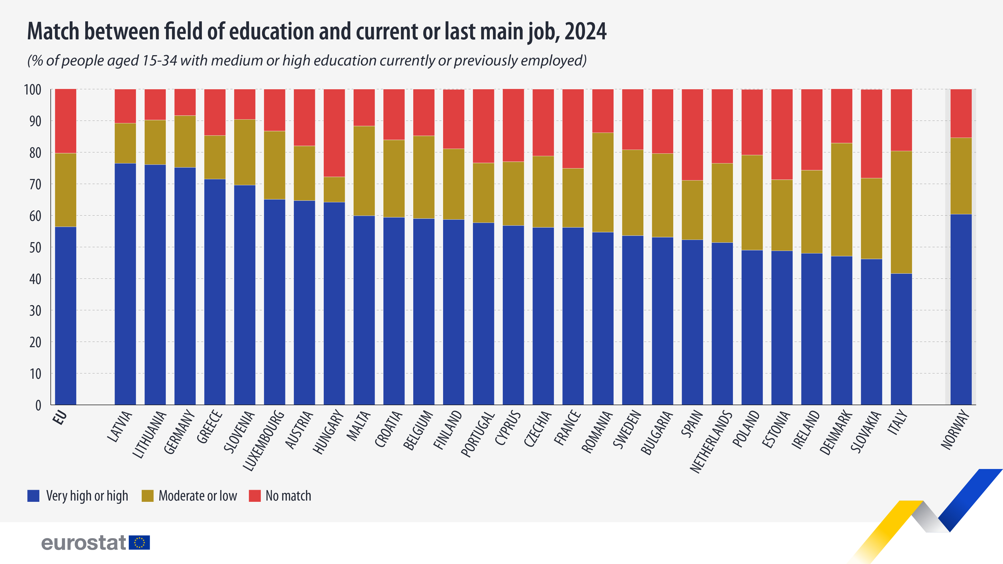 To 56,4% των νέων ηλικίας 15-34 ετών στην ΕΕ με μεσαίο ή υψηλό επίπεδο εκπαίδευσης ανέφεραν πολύ υψηλή ή υψηλή αντιστοιχία μεταξύ του τομέα εκπαίδευσής τους και των απαιτήσεων της εργασίας τους. Ξεχωριστά, το 46,1% των ατόμων με μεσαίο επίπεδο εκπαίδευσης και το 68,1% με υψηλό επίπεδο εκπαίδευσης ανέφεραν πολύ υψηλή ή υψηλή αντιστοιχία.