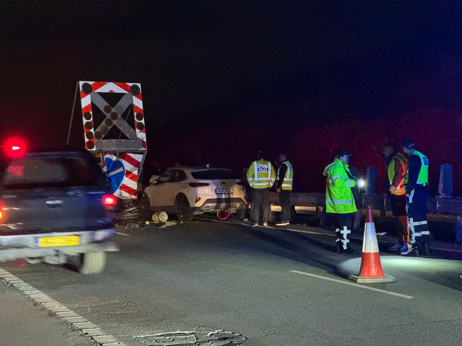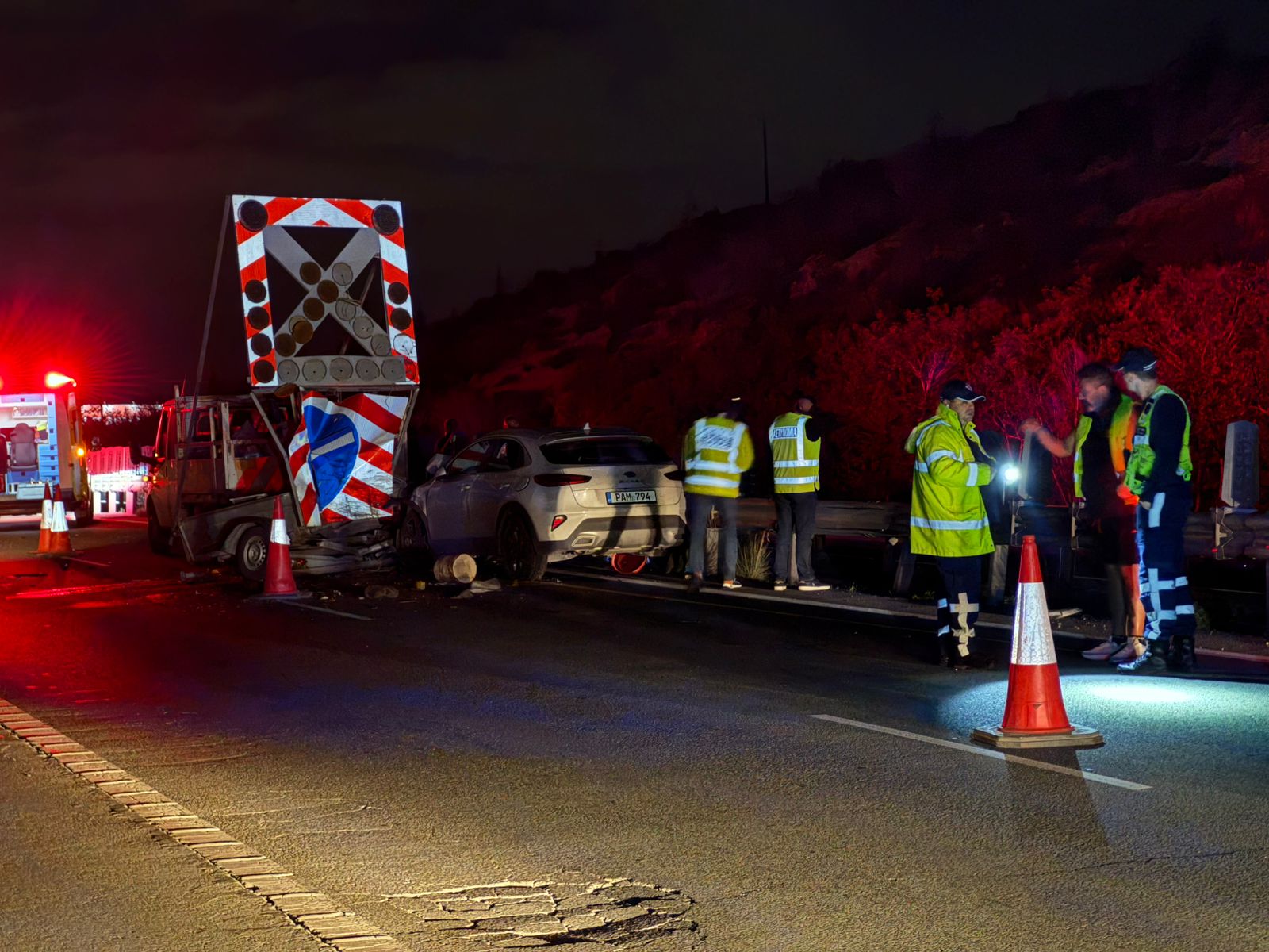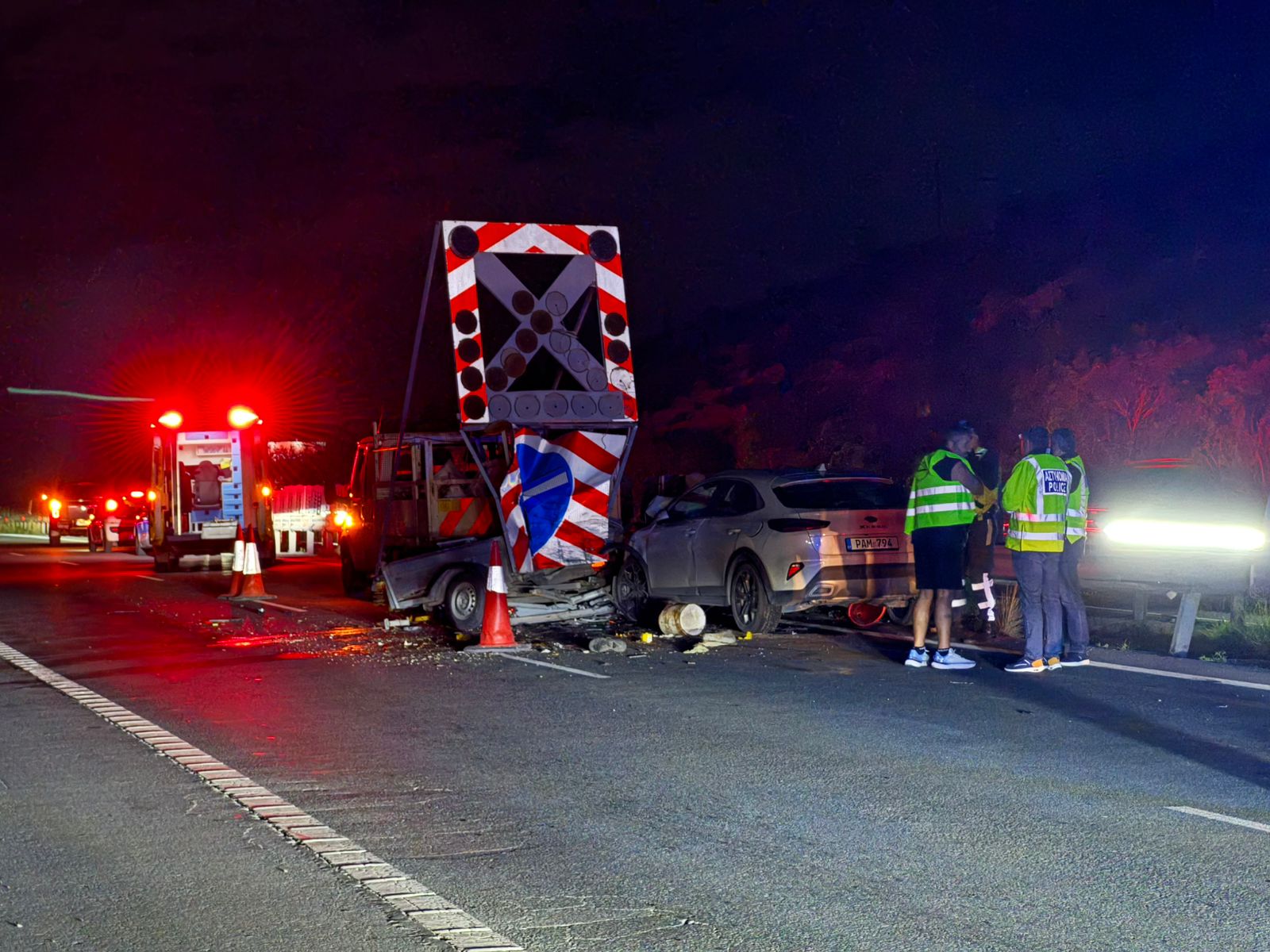 Το θανατηφόρο τροχαίο σημειώθηκε στις 19:25 στον αυτοκινητόδρομο Λευκωσίας – Λεμεσού, μετά το χωριό Μονή, στο ρεύμα προς Λεμεσό. Σύμφωνα με τα μέχρι στιγμής στοιχεία, 37χρονος οδηγός ιδιωτικού αυτοκινήτου, κάτω από συνθήκες που διερευνώνται, προσέκρουσε σε φωτεινό συρόμενο βέλος που βρισκόταν στη δεξιά λωρίδα, όπου εκτελούνταν οδικά έργα. Στο ίδιο σημείο εργάζονταν μαζί και άλλα τέσσερα πρόσωπα.