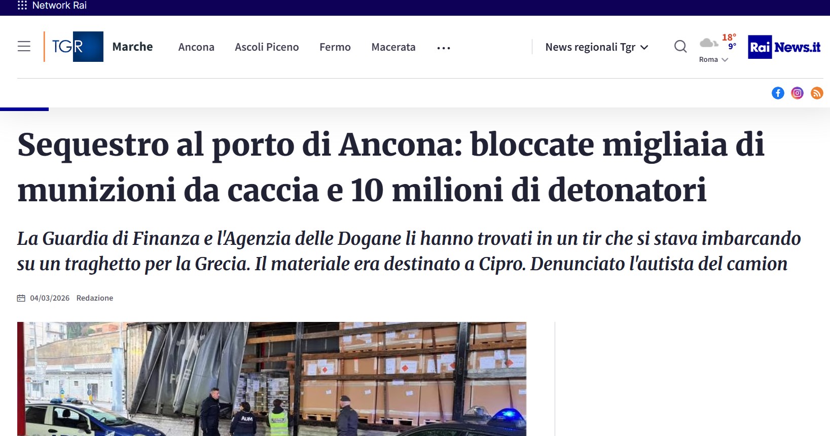 Σύμφωνα με δημοσίευμα της ιταλικής RAI, οι μεγάλες ποσότητες πυρομαχικών και πυροκροτητών κατασχέθηκαν στο λιμάνι της Ανκόνα στο πλαίσιο επιχείρησης των ιταλικών αρχών.