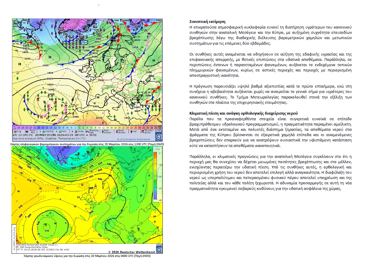 Σύμφωνα με τη μεσοπρόθεσμη κλιματική πρόγνωση του Climate Watch Advisory Group του Παγκόσμιου Μετεωρολογικού Οργανισμού (WMO), η περίοδος από τις 19 έως τις 31 Μαρτίου 2026 αναμένεται να χαρακτηρίζεται από βροχοπτώσεις πάνω από τα κανονικά για την εποχή επίπεδα σε τμήματα της κεντρικής και ανατολικής Μεσογείου, συμπεριλαμβανομένης και της Κύπρου.