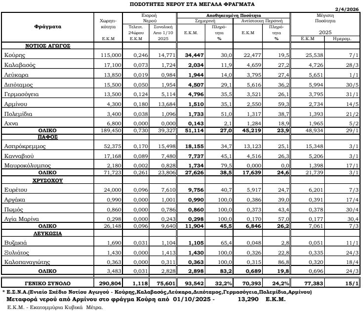 Σύμφωνα με τη σημερινή ενημέρωση του Τμήματος Αναπτύξεως Υδάτων, οι εισροές νερού στα φράγματα κατά το τελευταίο 24ωρο ήταν 1.118 Ε.Κ.Μ. νερού. Από την 1η του Οκτώβρη μέχρι και σήμερα Πέμπτη 2 Απριλίου, η συνολική εισροή ήταν 75.601 Ε.Κ.Μ. νερού.