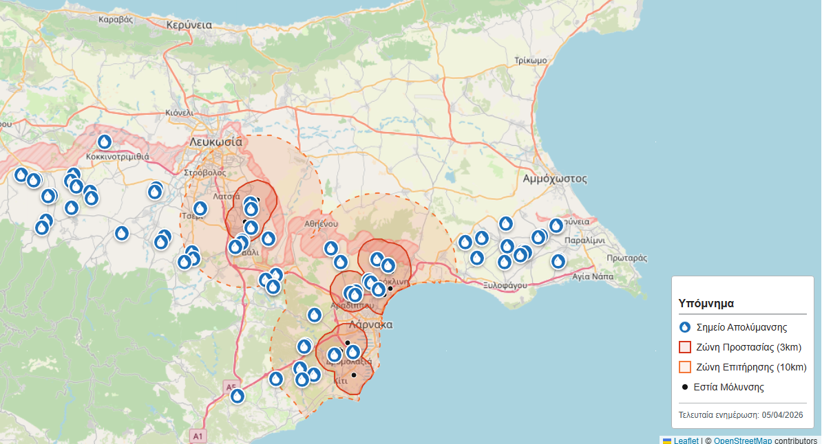 Διαδραστικός χάρτης με τις εστίες κρουσμάτων και ζώνες επιτήρησης