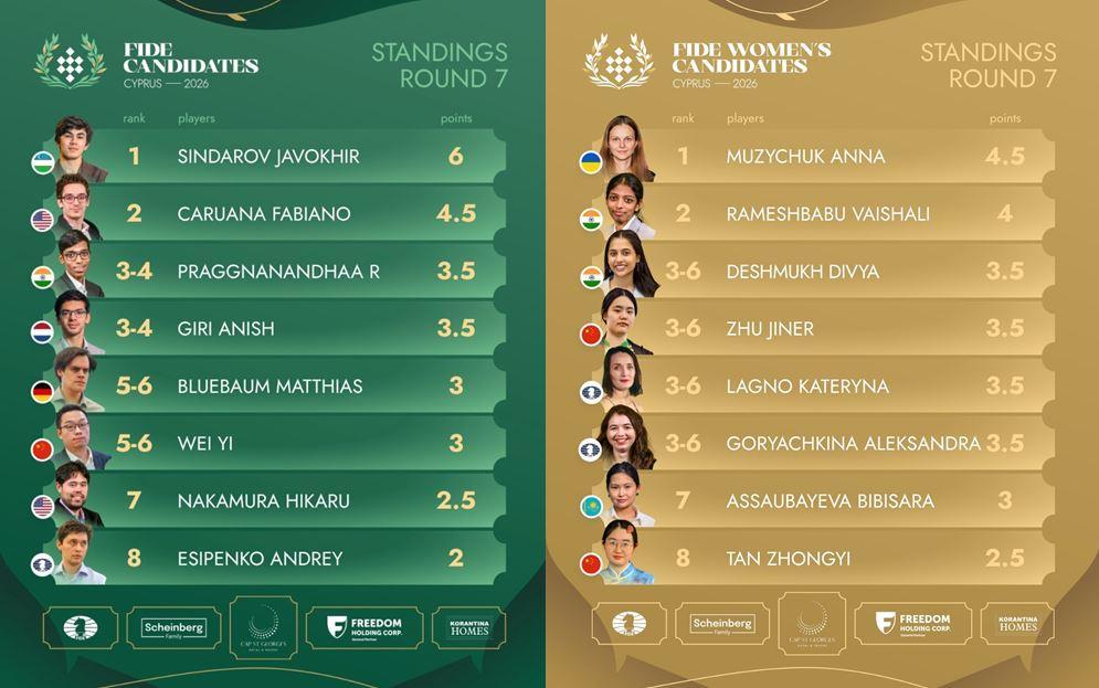 Στις 5 Απριλίου ολοκληρώθηκε ο πρώτος γύρος στο Τουρνουά Διεκδικητών για το Παγκόσμιο Πρωτάθλημα Σκακιού, που διεξάγεται στο ξενοδοχείο Cap St Georges στη δυτική ακτή της Κύπρου. Ο αστέρας της διοργάνωσης είναι ο 20χρονος Javokhir Sindarov, που κέρδισε πέντε από τις επτά παρτίδες του. Στο γυναικείο τμήμα, η 36χρονη Anna Muzychuk, που προστέθηκε στη σύνθεση μία εβδομάδα πριν την έναρξη, προηγείται στη βαθμολογία.