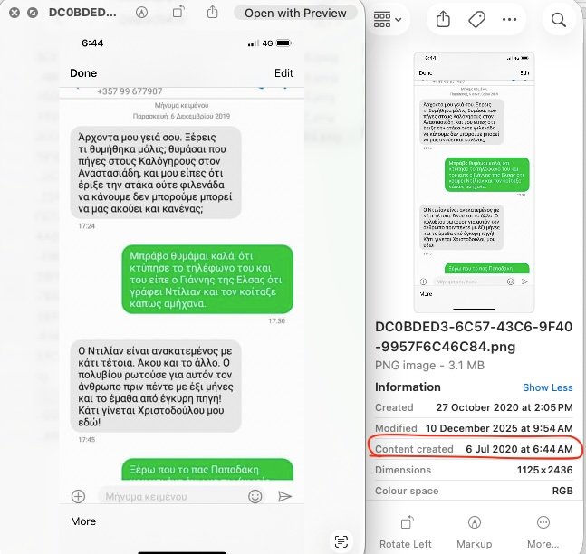 Ο πραγματογνώμονας, Αλέξης Μαύρος, μιλώντας στη δημοσιογραφική διάσκεψη που παρέθεσε ο τέως ευρωβουλευτής Δημήτρης Παπαδάκης, εξήγησε ότι η ανάλυση δεν περιορίστηκε στο αν «βρέθηκαν ή όχι» τα επίμαχα μηνύματα, αλλά επεκτάθηκε στη συνολική δραστηριότητα των συσκευών, με δημιουργία πλήρους χρονολογίου χρήσης (timeline) σε επίπεδο δευτερολέπτου. Όπως ανέφερε, στο χρονικό σημείο όπου φέρονται να υπάρχουν τα επίμαχα μηνύματα, από το ψηφιακό αποτύπωμα προκύπτει διαφορετική χρήση της συσκευής, κάτι που, όπως είπε, δεν συνάδει με την υποτιθέμενη αποστολή ή λήψη τους.