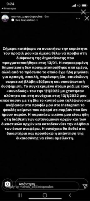 Λίγες ώρες αργότερα, όμως, ο Μάνος Παπαδόπουλος επανήλθε και με νέα ανάρτησή του σε μια άλλη κατεύθυνση, υποστήριξε ότι όσα είχαν γραφεί σχετικά στην ανάρτησή του δεν ήταν από τον ίδιο, αλλά από πρόσωπο, το οποίο έχει ήδη μηνύσει για αρπαγή, απειλή και παράνομη βία.