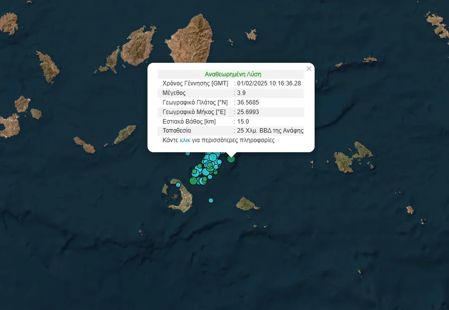 Στις 12:16 καταγράφηκαν 3,9 της κλίμακας Ρίχτερ, 25 χλμ βόρεια-βορειοδυτικά της Ανάφης, με το εστιακό βάθος να εντοπίζεται στα 15 χλμ.