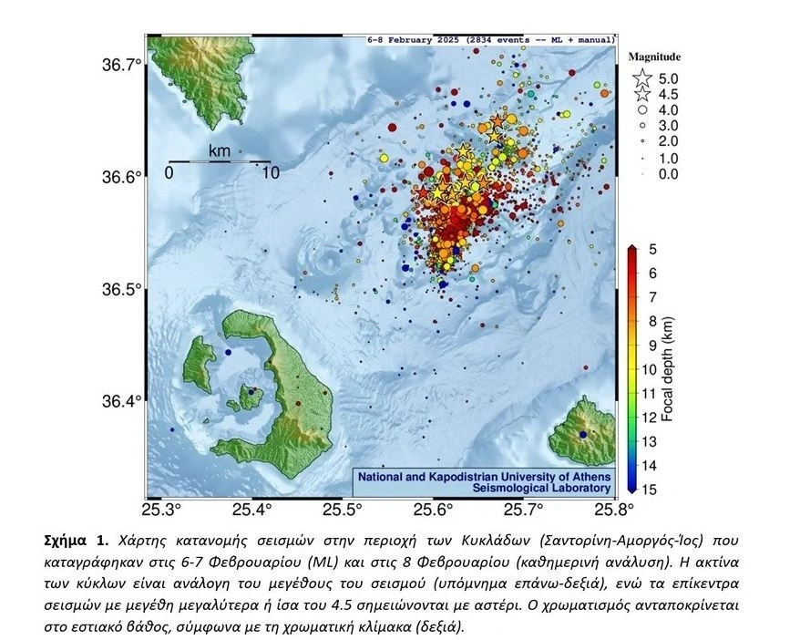 Από την έναρξη του σεισμικού σμήνους στη ζώνη Σαντορίνης – Αμοργού στις 26 Ιανουαρίου έως και τις 7 Φεβρουαρίου 2025, το Εργαστήριο έχει ανιχνεύσει και εντοπίσει συνολικά πάνω από 11,700 επιλεγμένους σεισμούς με μεθόδους μηχανικής μάθησης (τεχνητής νοημοσύνης), εκ των οποίων άνω των 9,600 με μεγέθη Μ³1.0.