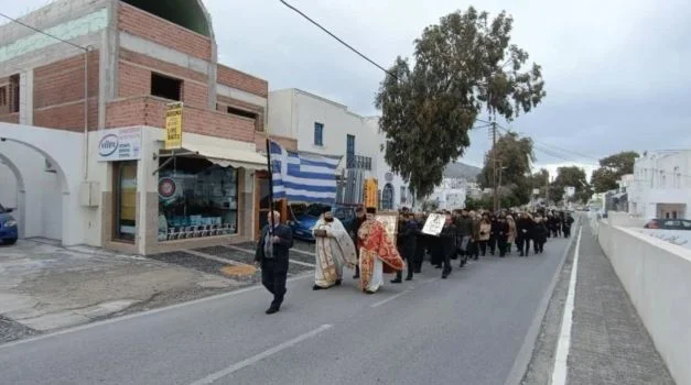 Συγκεκριμένα, οι κάτοικοι και οι κληρικοί κρατούσαν ελληνικές σημαίες, λάβαρα και ιερά κειμήλια, διασχίζοντας τους δρόμους του χωριού, ζητώντας την προστασία του Θεού ώστε να φέρει την ηρεμία στην περιοχή. Η λιτανεία, που αποτελεί μια παράδοση δεκαετιών στο νησί, είχε φέτος έναν ιδιαίτερο συμβολισμό, καθώς οι κάτοικοι εκφράζουν την ανησυχία τους για τις συνεχείς σεισμικές δονήσεις που σημειώνονται στην περιοχή τις τελευταίες ημέρες.