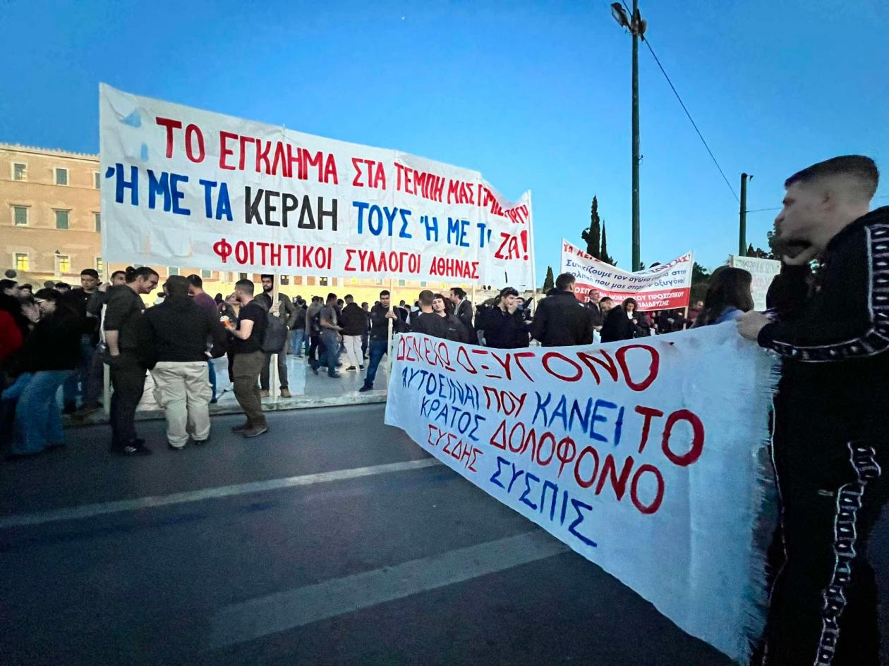Όταν η πορεία έφτασε μπροστά από το Κοινοβούλιο, φοιτητές κρατώντας χαρτόνια σχημάτισαν σύνθημα «Ή τα κέρδη τους ή οι ζωές μας».