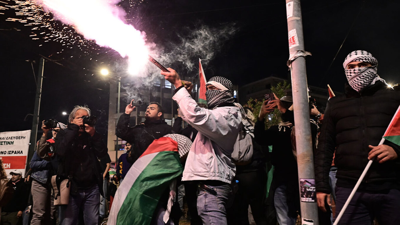 Επεισόδια ξέσπασαν το βράδυ της Τρίτης στην Κηφισίας στο ύψος της πρεσβείας του Ισραήλ, μετά την ολοκλήρωση της πορείας αλληλεγγύης υπέρ των Παλαιστινίων.
