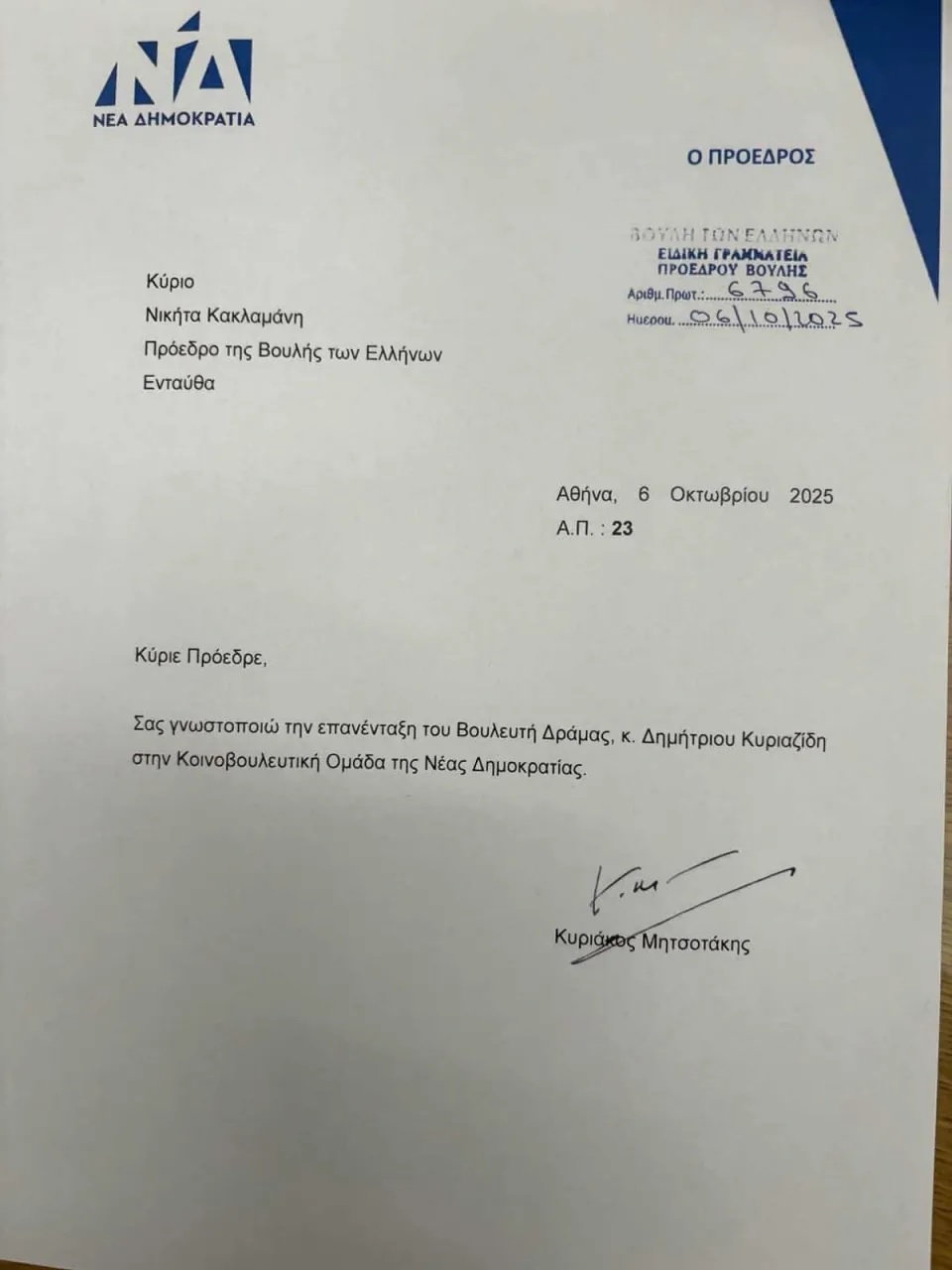 Επέστρεψε στη Νέα Δημοκρατία ο Δημήτρης Κυριαζίδης, οπότε και πάλι η ΚΟ της «γαλάζιας» παράταξης αριθμεί 156 βουλευτές.