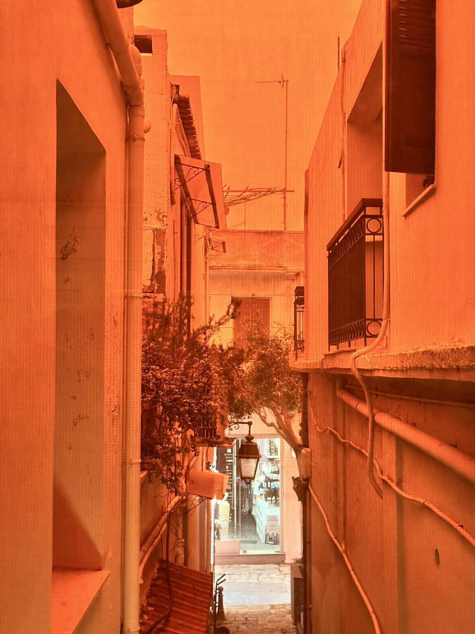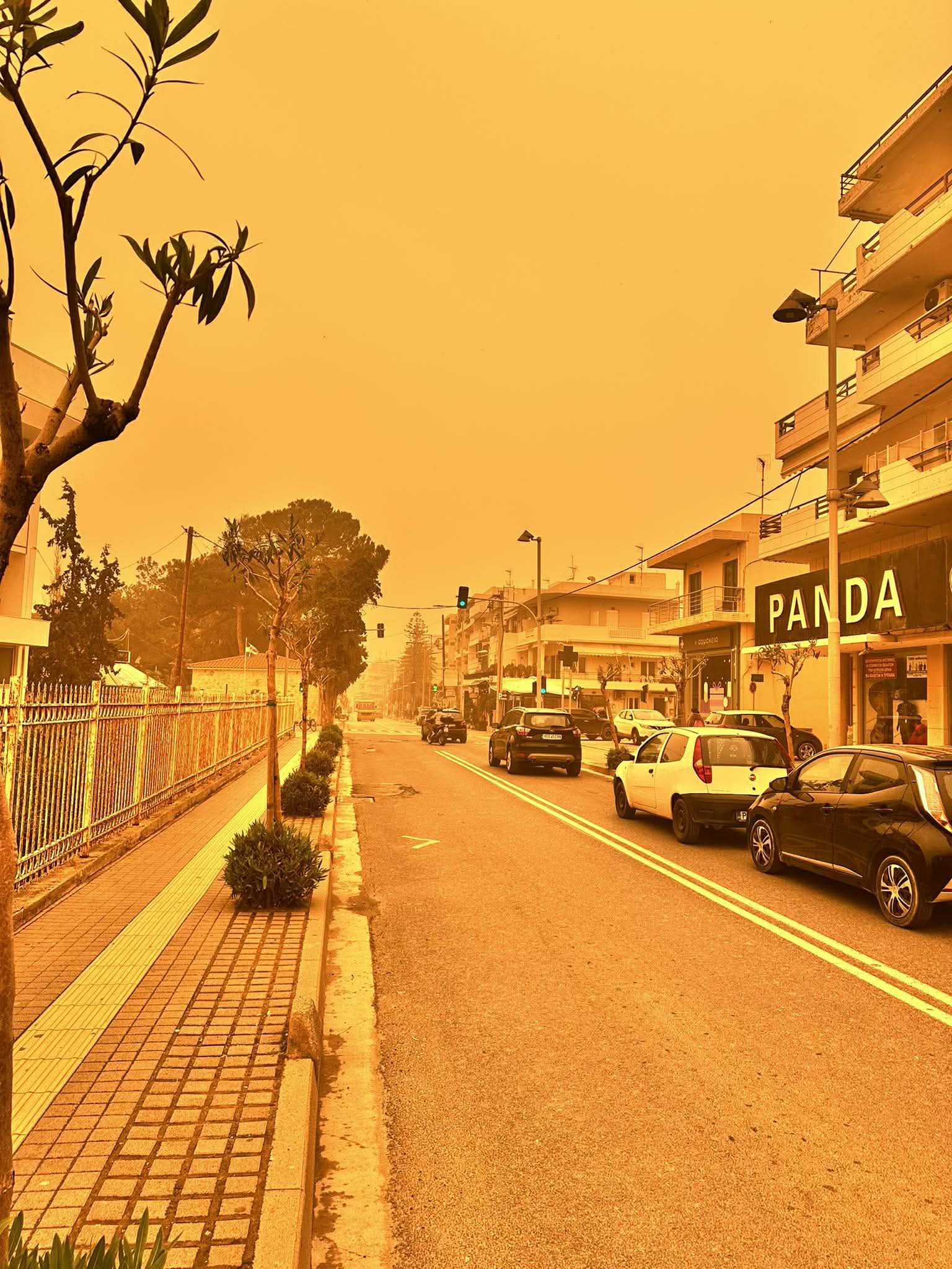 Οι εικόνες από το drone του Orange Press Agency αποτυπώνουν το μέγεθος του φαινομένου, καθώς η ορατότητα είναι εξαιρετικά περιορισμένη και ολόκληρη η πόλη έχει καλυφθεί από ένα απόκοσμο, πορτοκαλί χρώμα, που πιο πολύ θυμίζει τοπίο αφρικανικό ή και τον κόκκινο πλανήτη, Άρη.