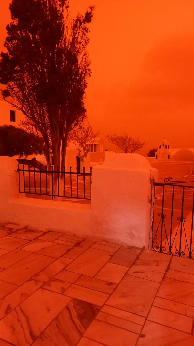 Ιδια κατάσταση επικρατεί τις τελευταίες ώρες και στη Σαντορίνη με τον ουρανό της Οίας να να έχει γίνει κατακόκκινος εξαιτίας της σκόνης.